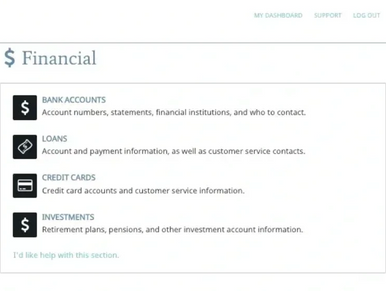 The Legacy Vault provides a secure and organized way to store and manage your financial information, including bank accounts, loans, credit cards, investments, and more. By keeping all your financial details in one encrypted location, you ensure that your loved ones have easy access to critical information when they need it most. Whether it’s tracking assets, liabilities, or key account details, this feature helps streamline financial management and ensures a smooth transition of responsibility in case of an emergency. With The Legacy Vault, your financial records are always protected and accessible to those who matter most.