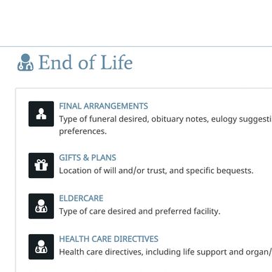 The Legacy Vault provides a secure and organized way to document your end-of-life wishes, ensuring your loved ones have clear guidance during difficult times. From funeral arrangements and healthcare directives to eldercare plans and special gifts, you can outline every detail according to your wishes. By storing this information in one accessible and protected place, you relieve your family of the burden of uncertainty and give them the gift of clarity and peace of mind. With The Legacy Vault, you can rest assured that your final wishes will be honored exactly as you intended.