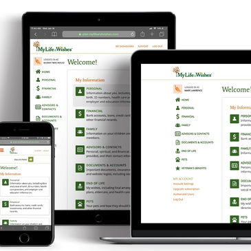 My Life & Wishes is an online service that allows you to store a digital record of important documents, passwords, and end-of-life plans. Accessible 24/7 in the event of any emergency. Securely and easily, share information about finances, insurance, wills and funeral wishes with family and loved ones.